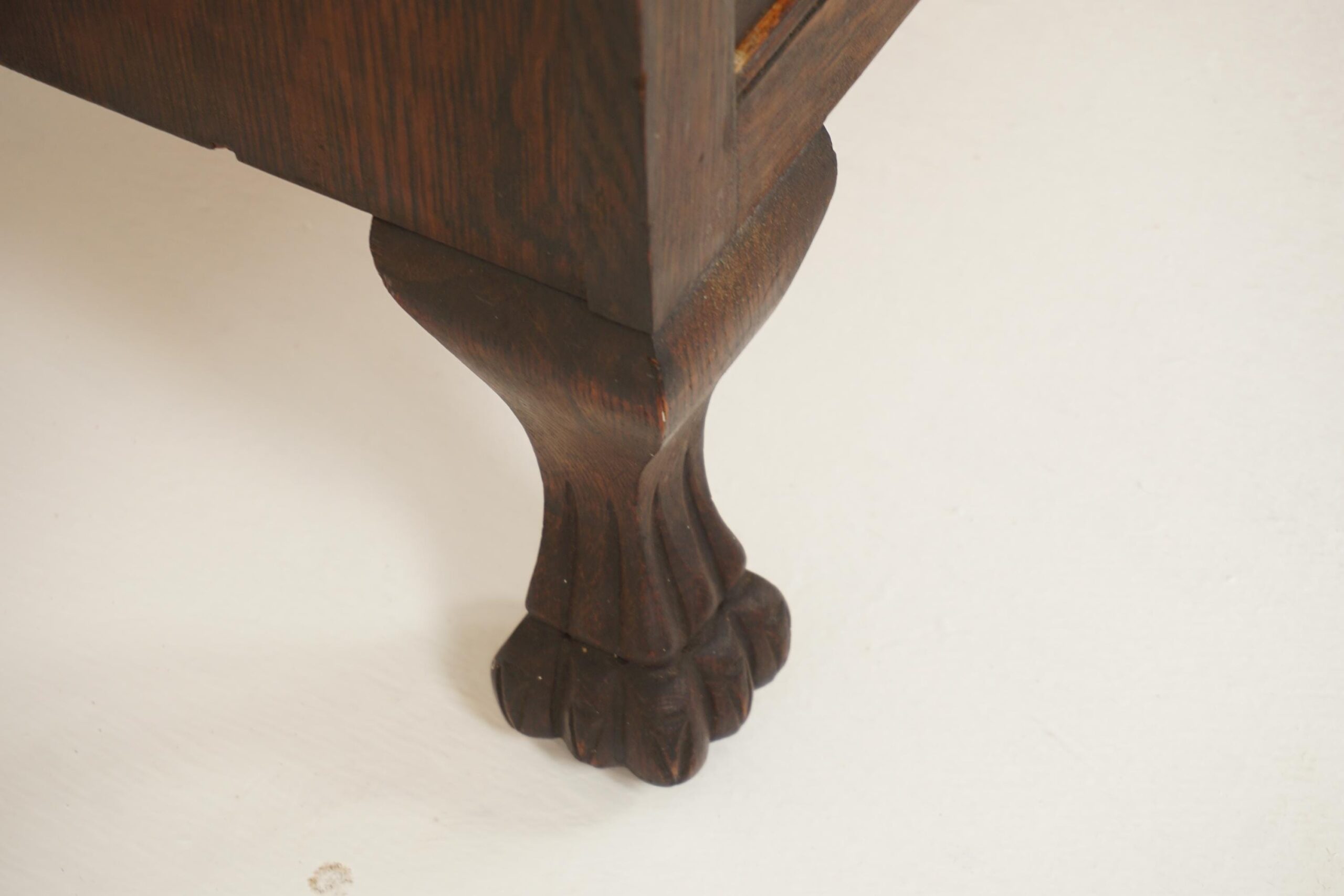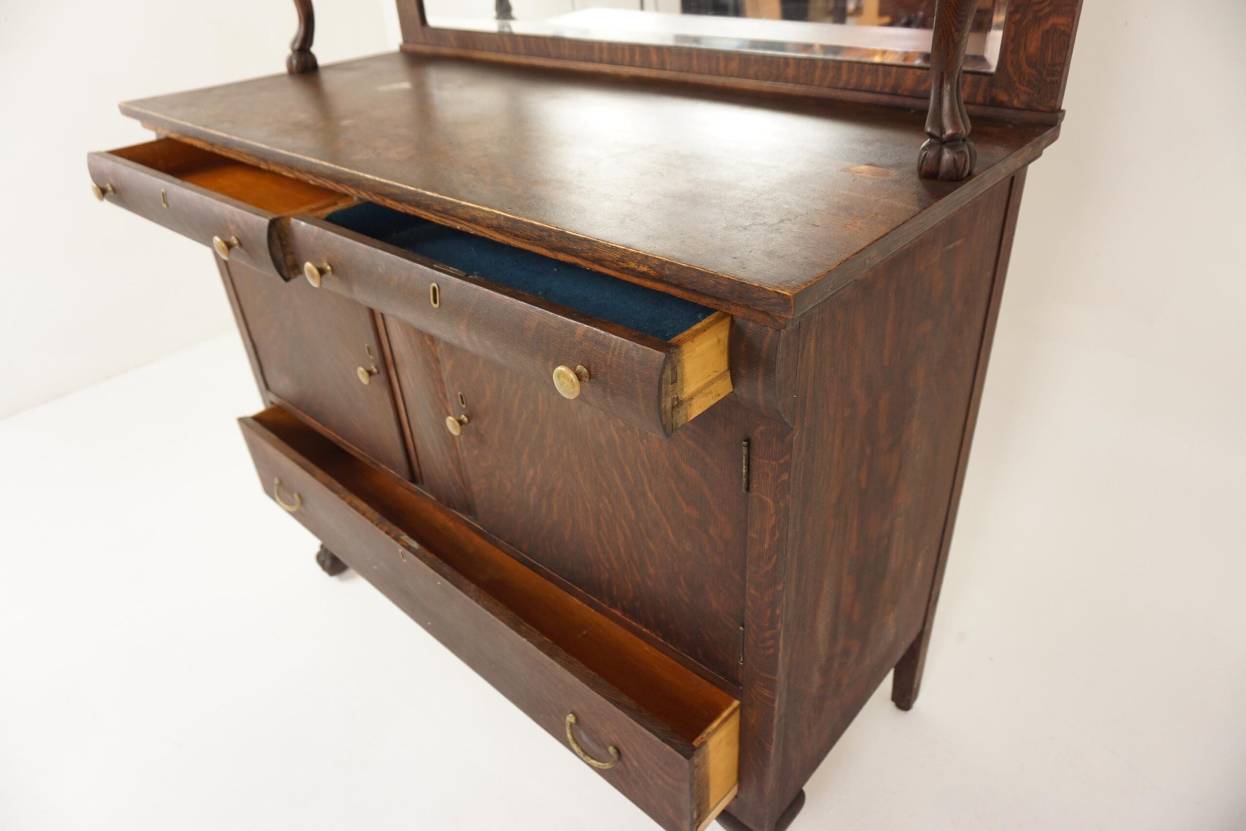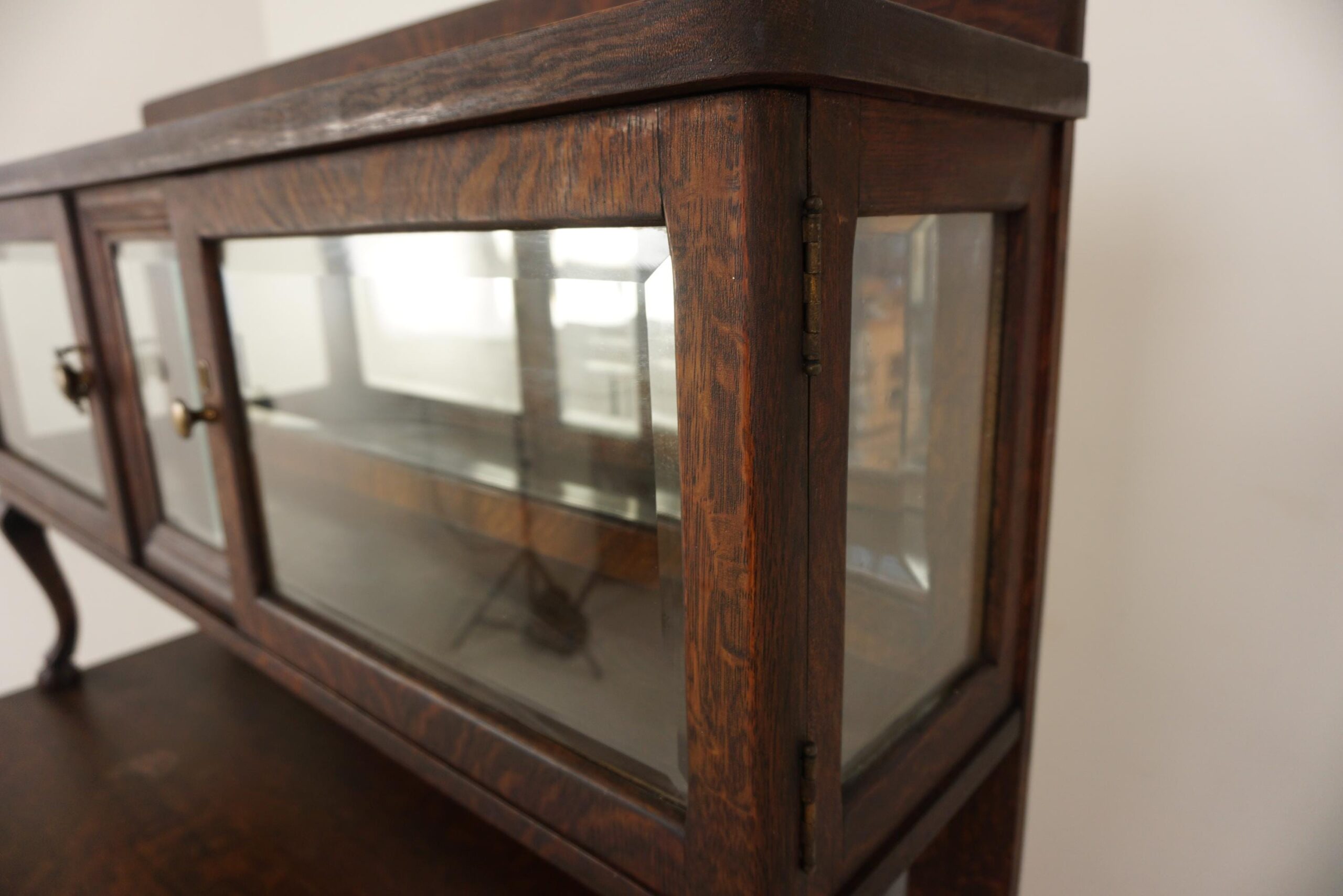 This cabinet stands on a pair of shaped oak legs with a beveled mirror on the back