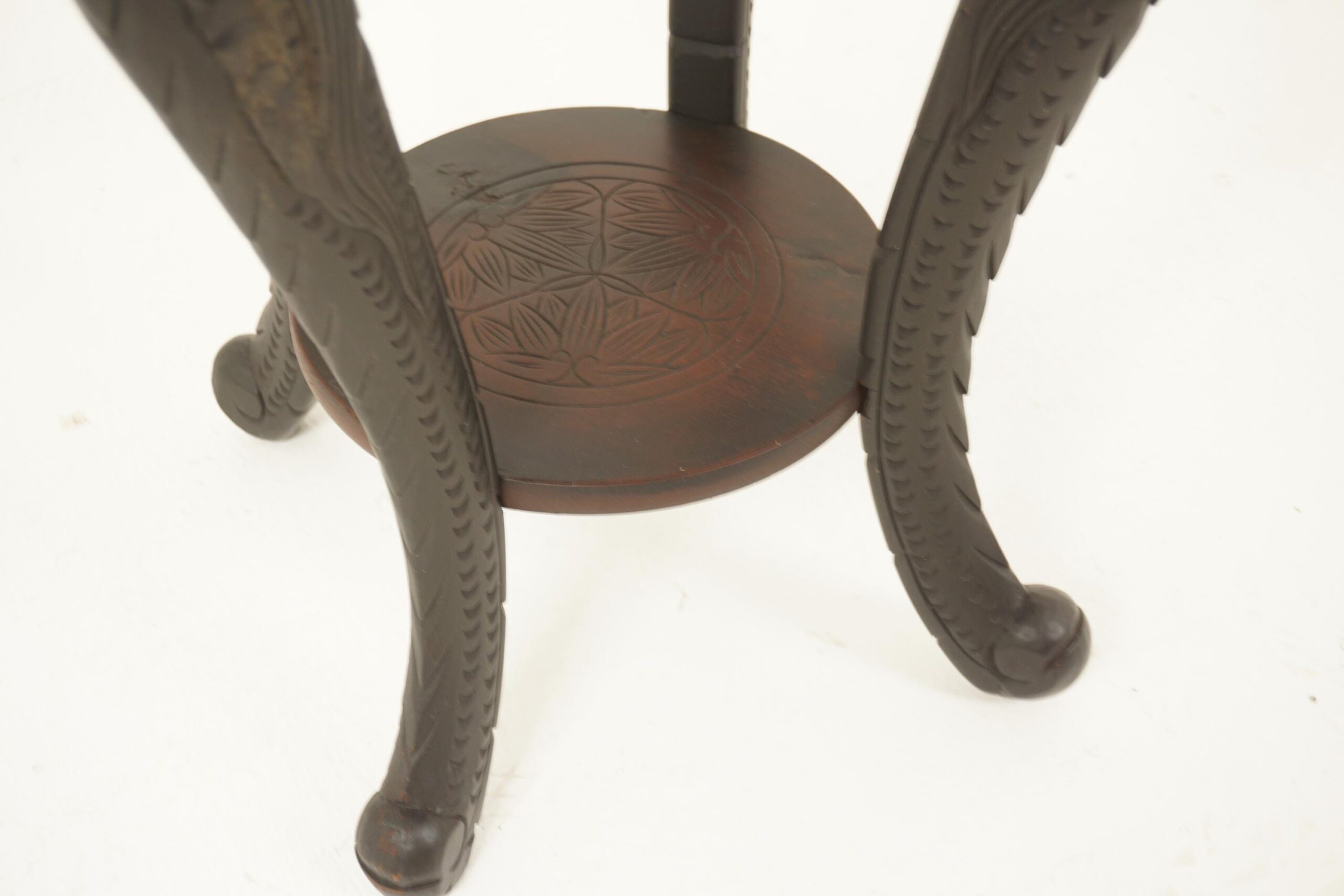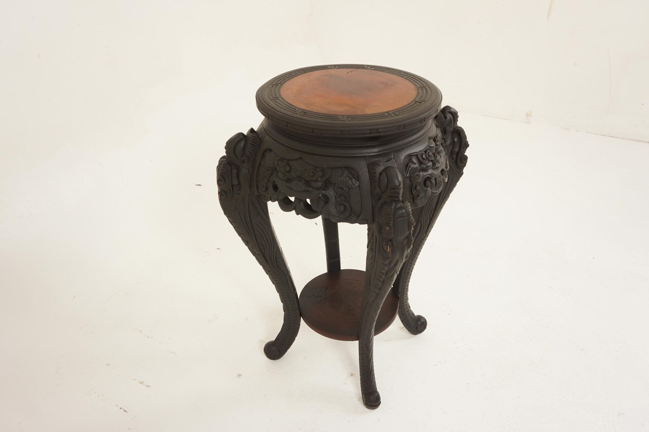 Standing on carved cabriolet legs with circular carved shelf underneath