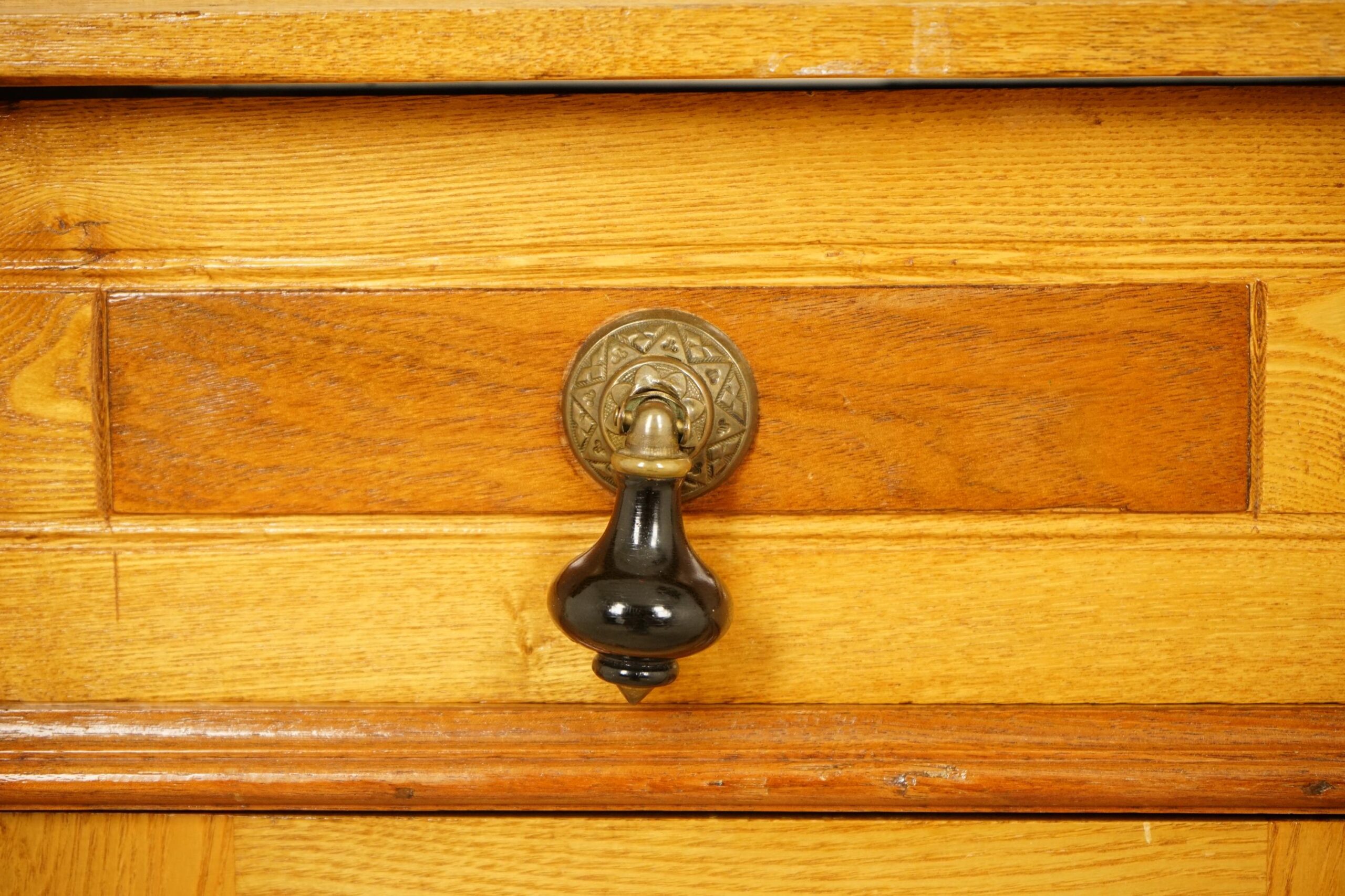 This antique chip-carved Eastlake washstand or bedside dresser is a charming piece of late 18th century furniture reflecting the Eastlake style, popularized by Charles Eastlake. This style emphasizes geometric patterns, incised carvings band a more rectilinear approach to design compared to heavier ornamentation of Victorian styles.