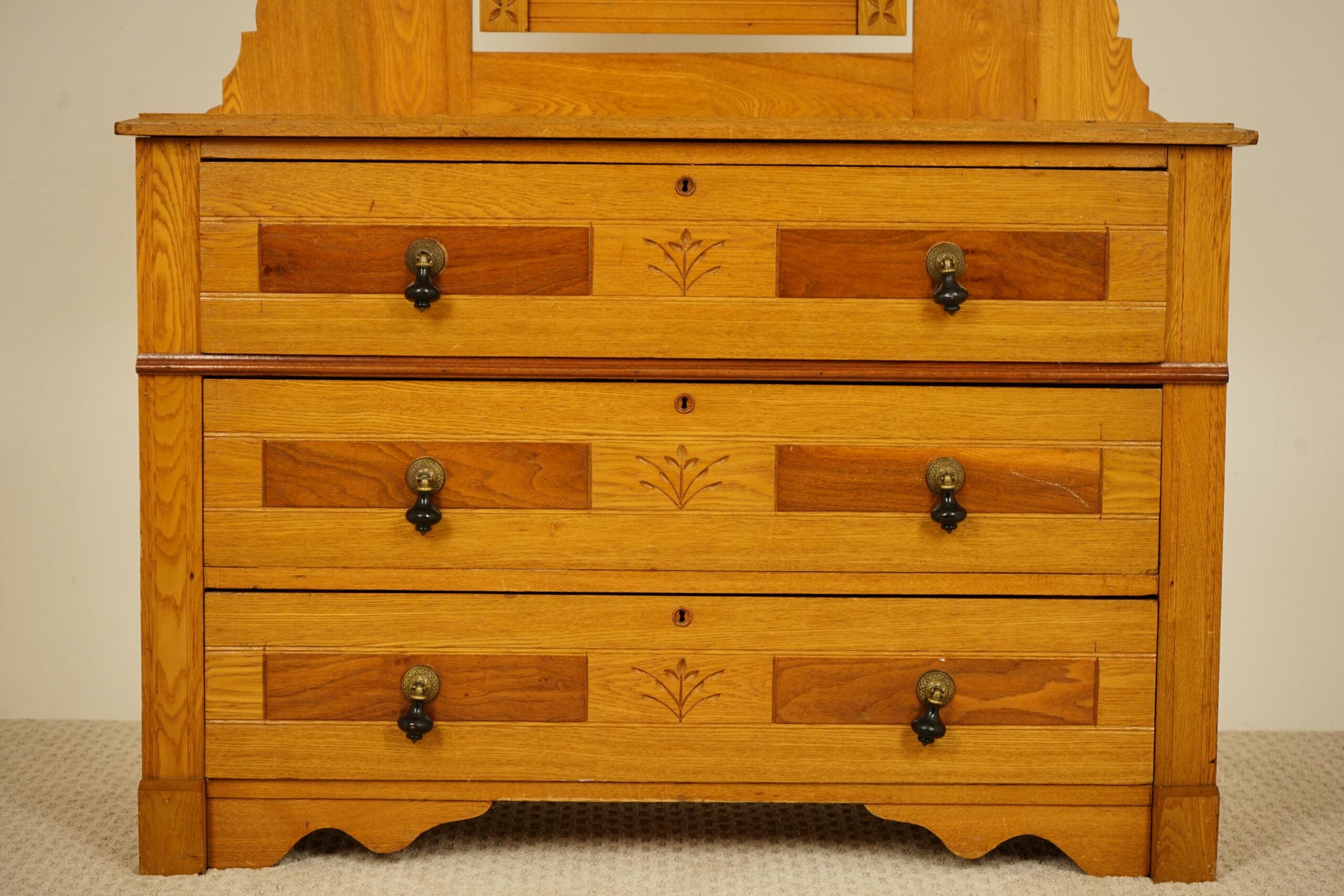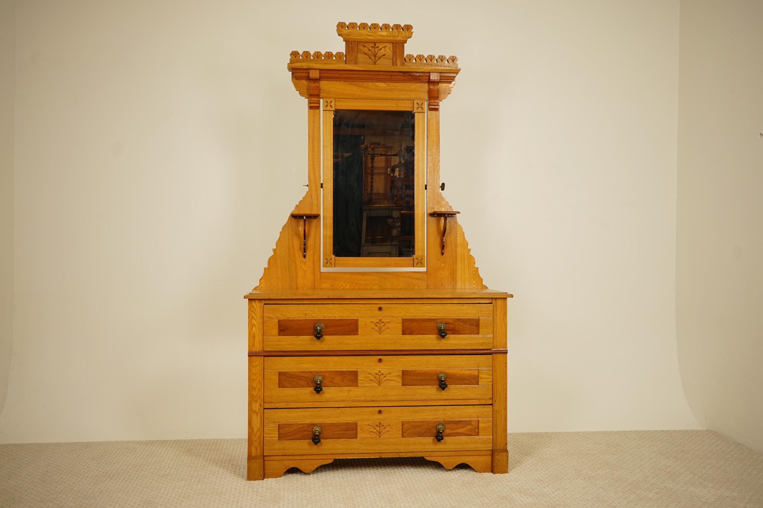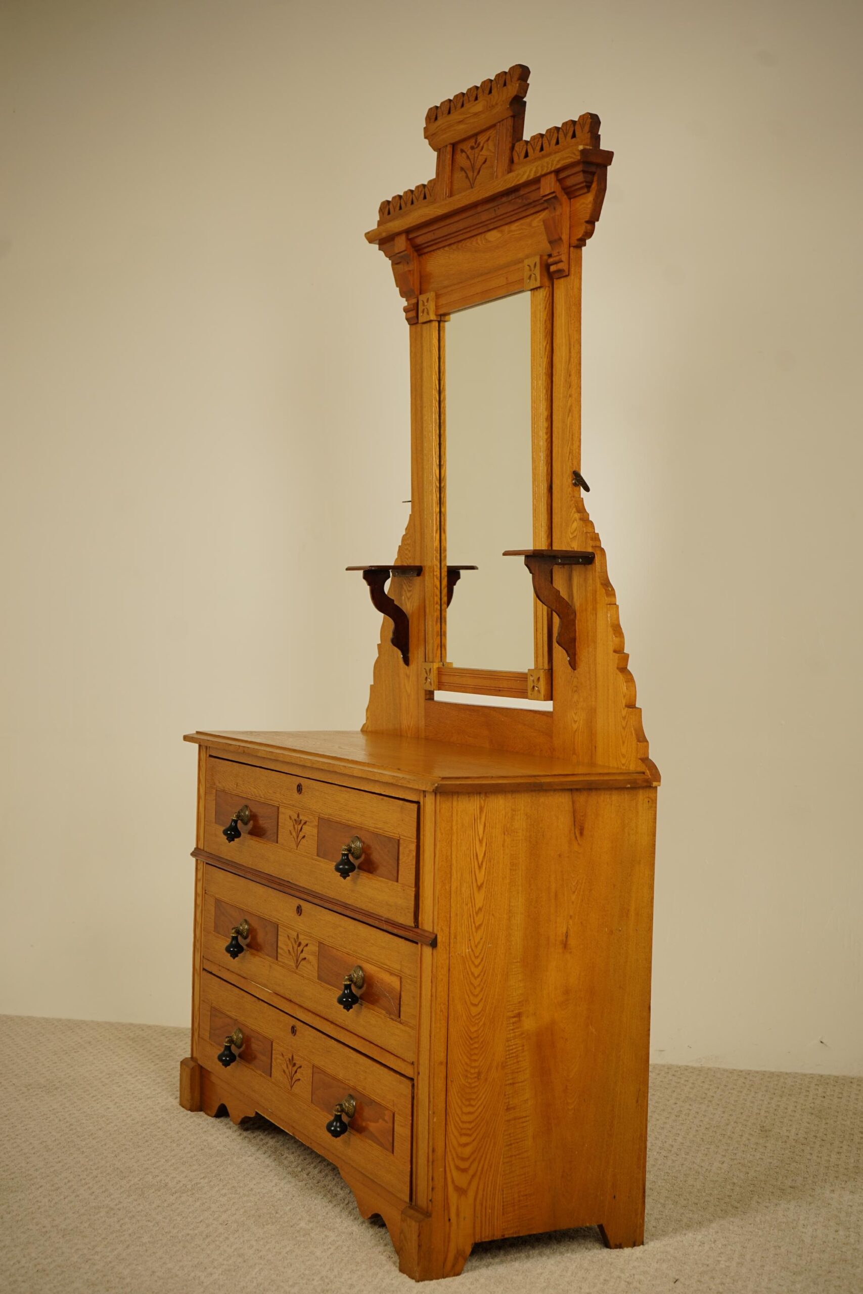 Antique Chip Carved Tall Ash Vanity with Mirror, Dresser, Chest of Drawers American 1880 F-1549C