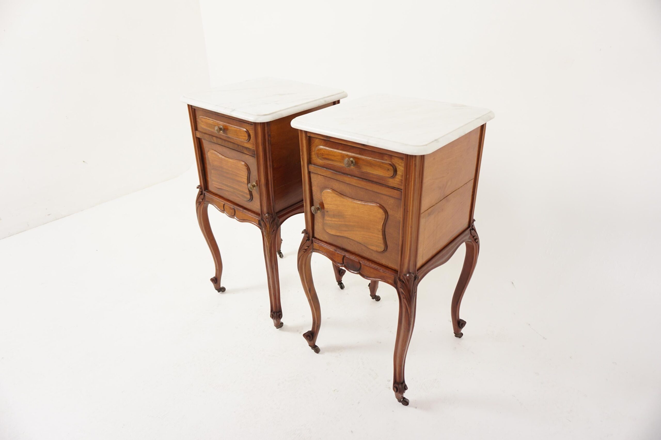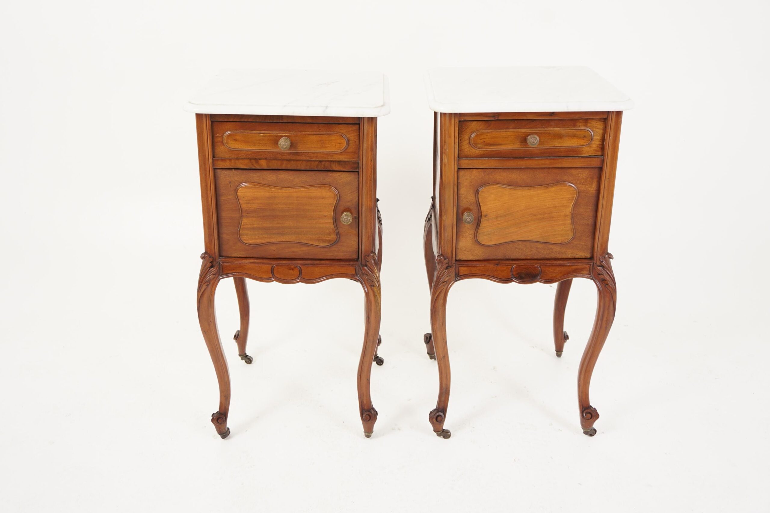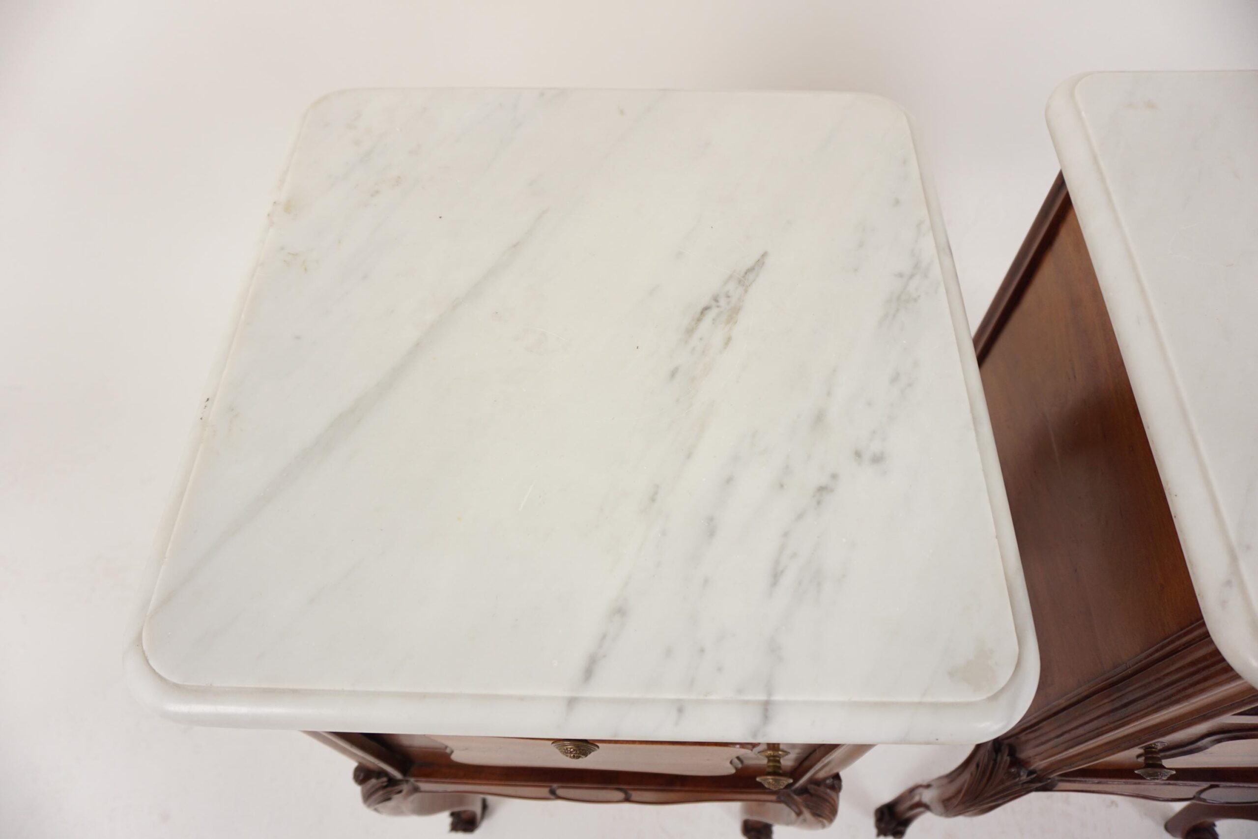 pair of Antique French Louis XV Walnut Marble Top Nightstands, Bedsides Tables – France 1900 F-1502