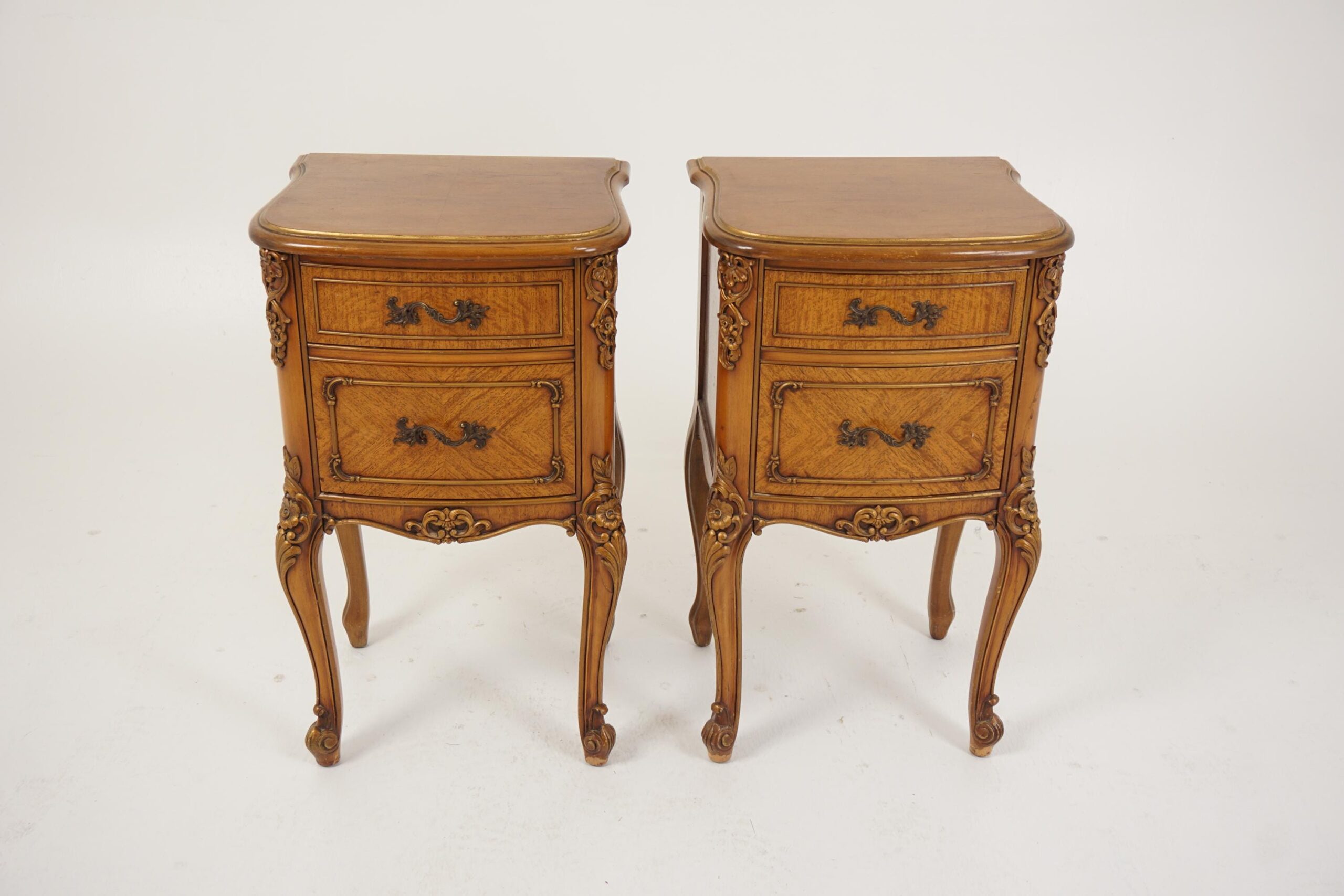 2. Nightstands: Two matching nightstands with delicate carvings, bow front shaped tops have a pair of dovetailed drawers with paneled front and original brass handles. 17.5"W x 17.5"D x 34.5"H