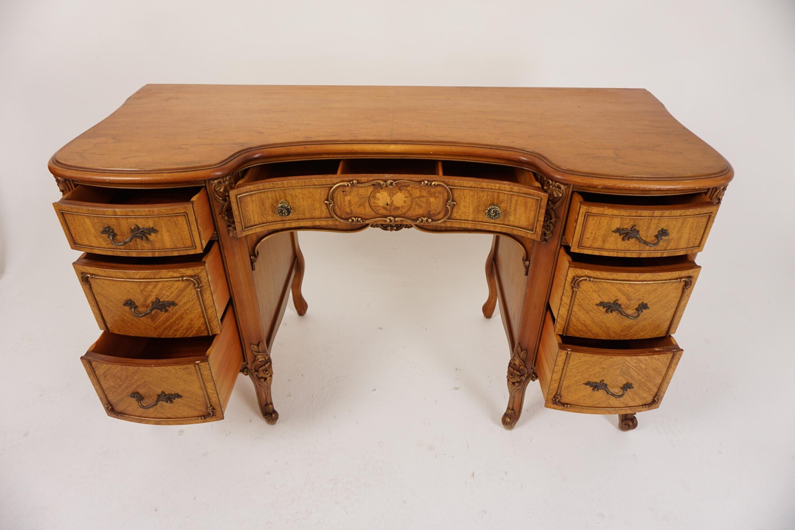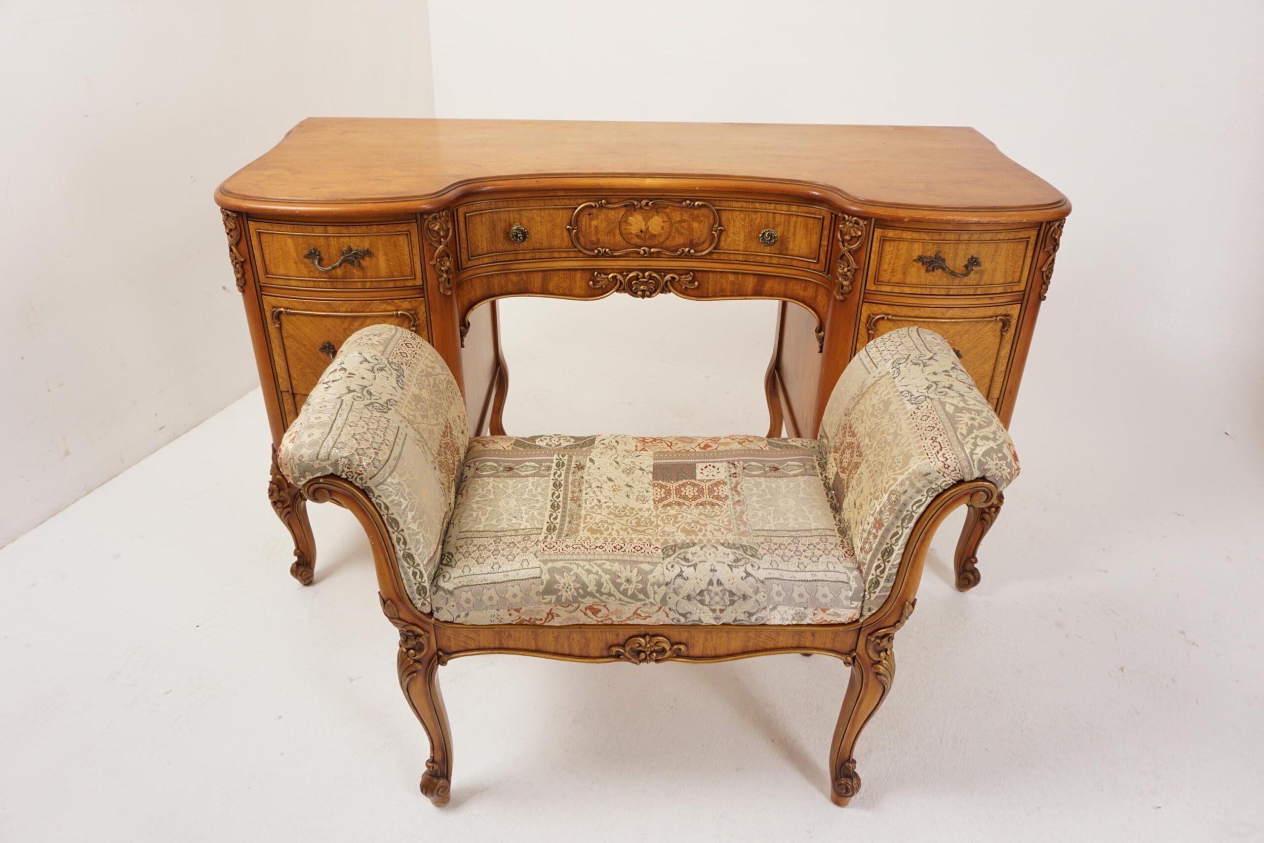 4. Vanity: A beautifully crafted vanity with satinwood finish and burr walnut accents provides a perfect spot for morning routines. Inverted top with bow front ends, single inlaid drawer flanked by six graduating bow front drawers. With original shaped brass handle, all standing on carved cabriole legs 52'W x 20"D x 30"H