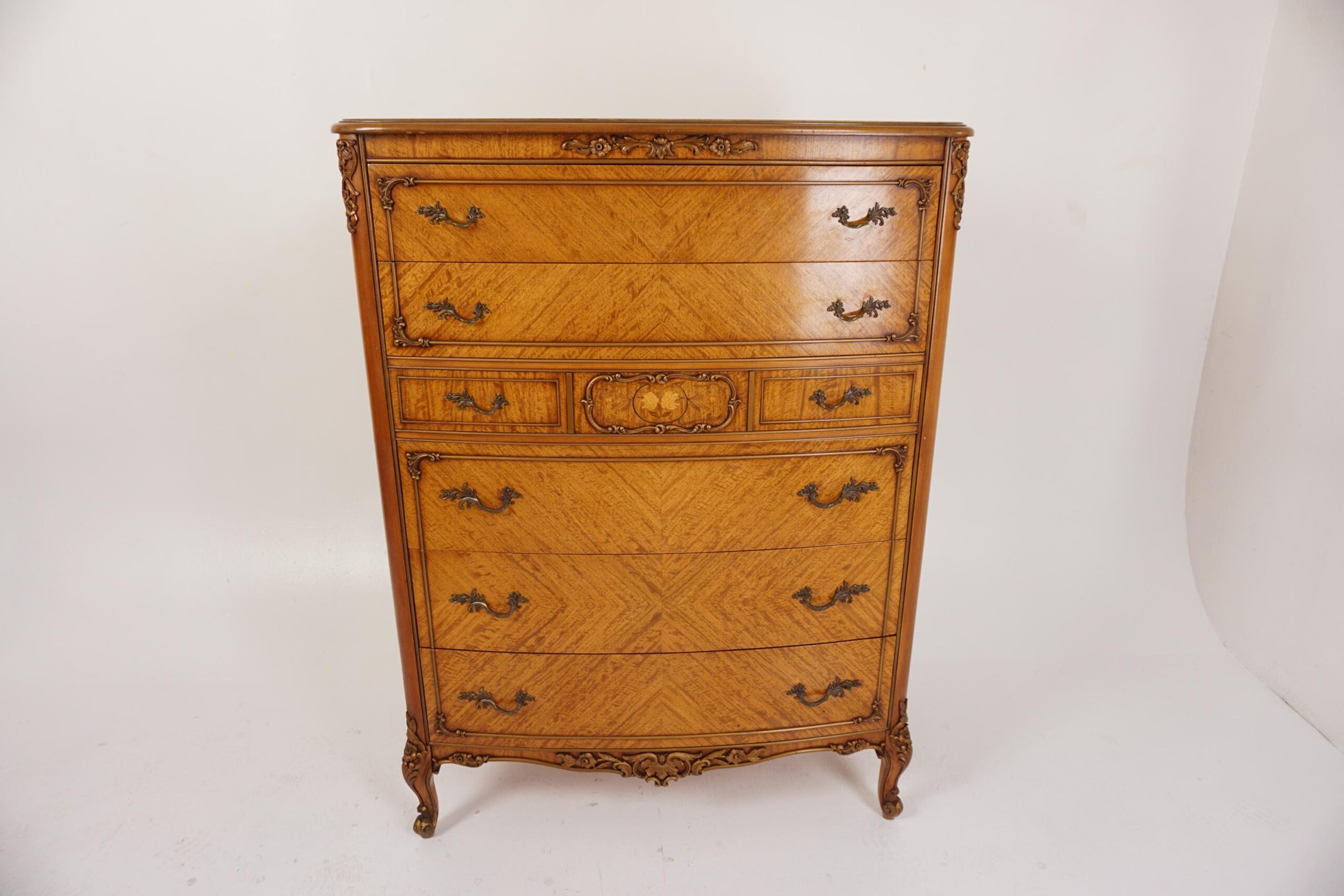 1. Dresser: With ornate carvings and curved lines, this dresser features ample storage. Shaped bow front molded top, six graduating drawers with one having an inlaid marquetry front, with dovetailed drawer and ornate brass handles. All standing on short cabriole legs with carved acanthus leaves. Wonderful quality and in great condition