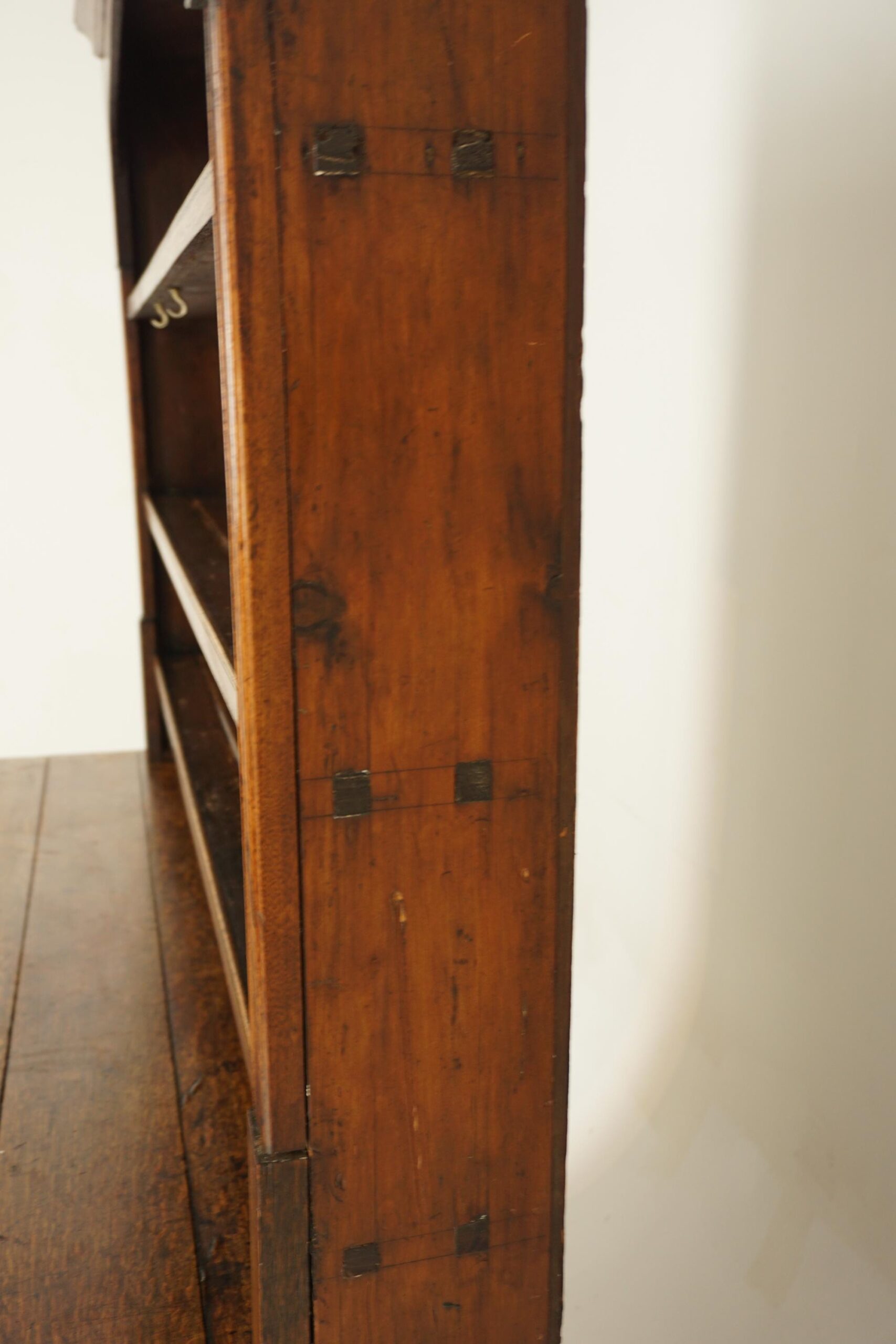 Carved frieze on top with three shelves with molded fronts below