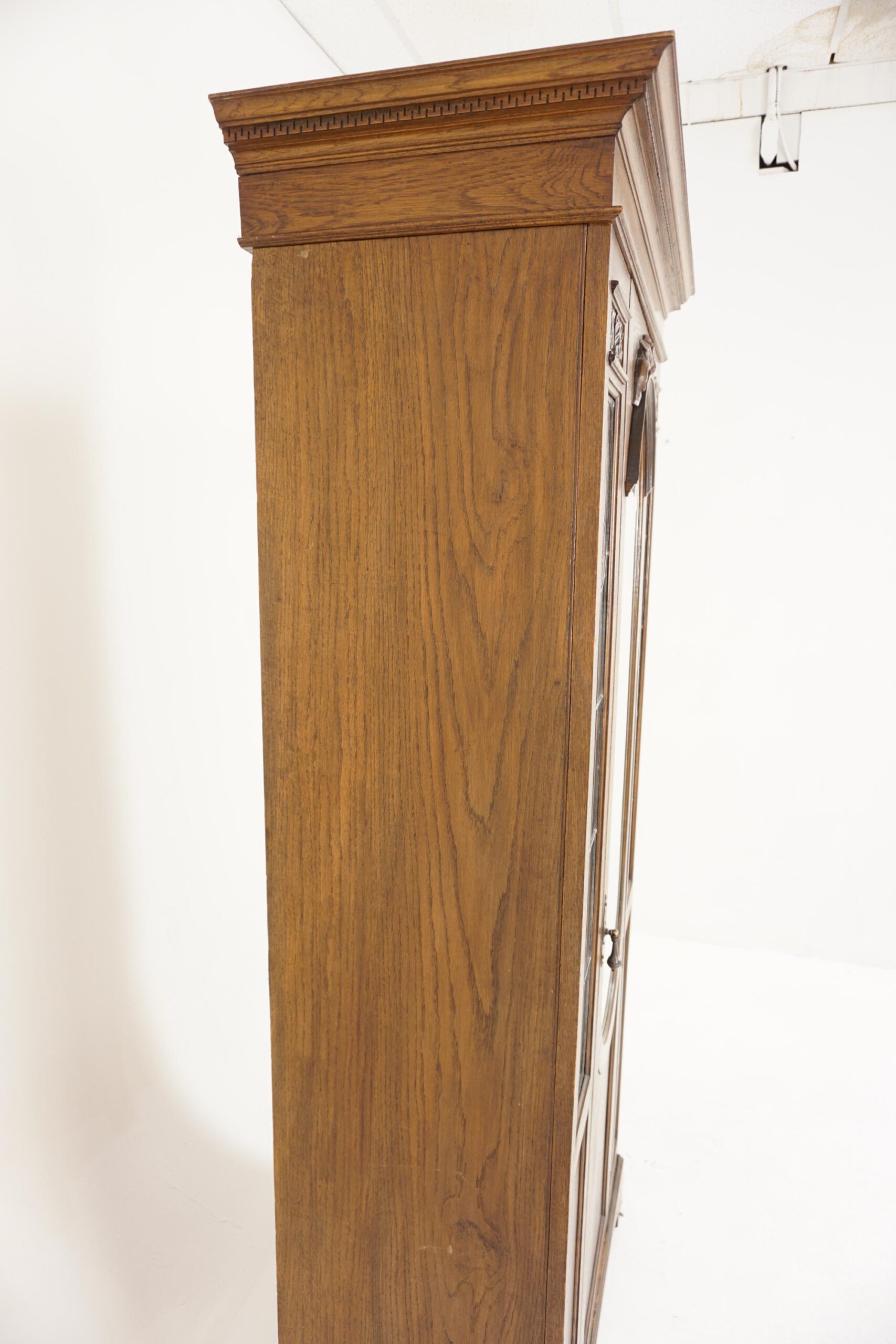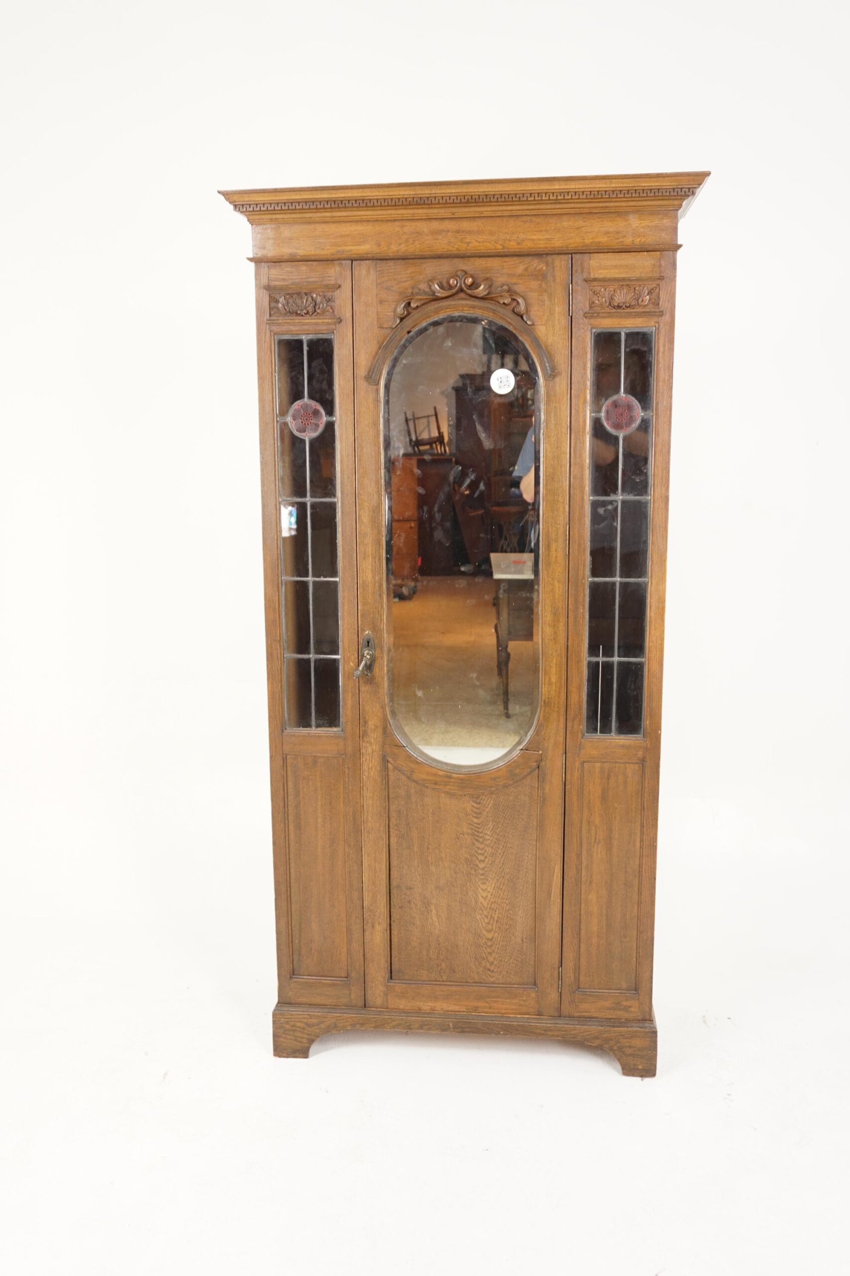 Antique Oak Arts and Craft Mirror Back Hall Armoire, Wardrobe, Closet, Leaded Glass, Scotland 1910, H247