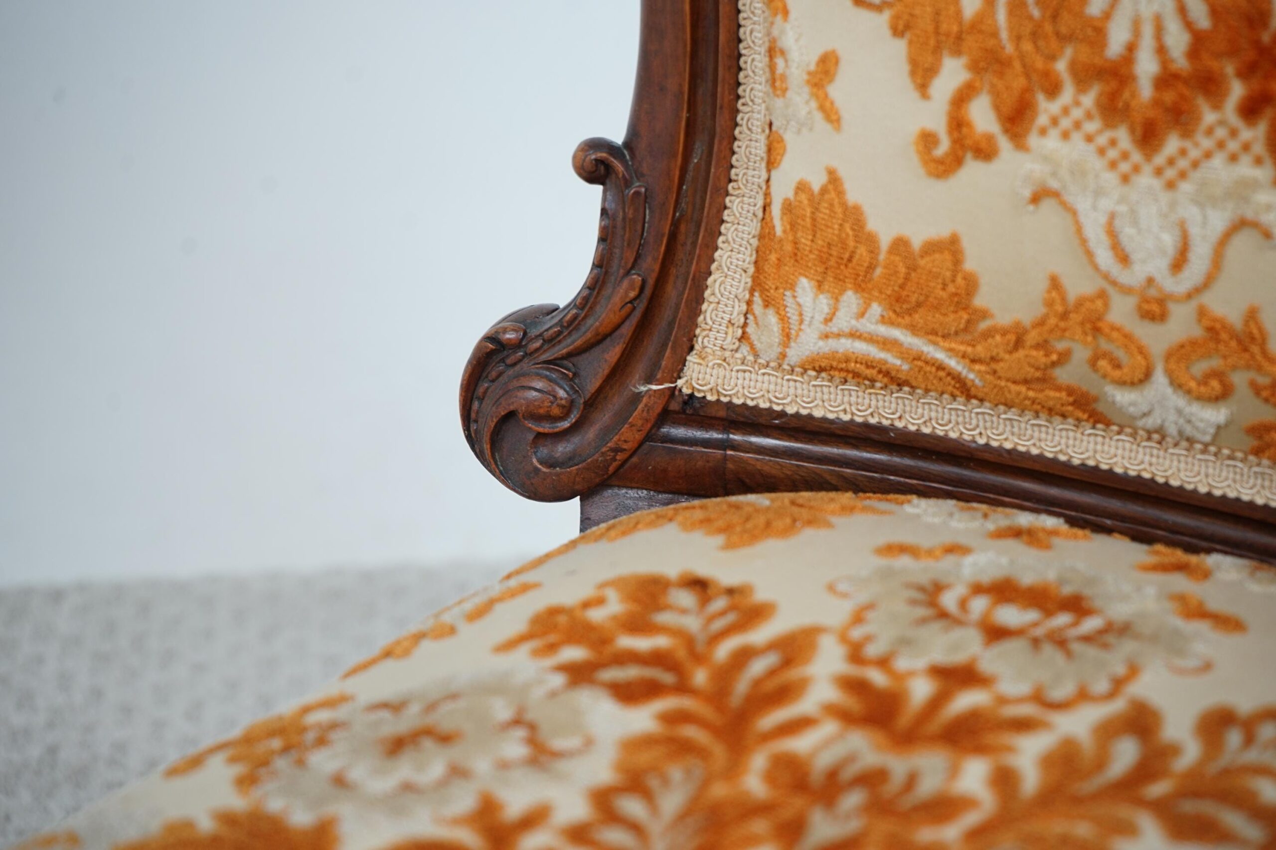 Beautifully hand carved crisp floral rosettes to the top, flanked by scrolling carved panels with foliate designs.