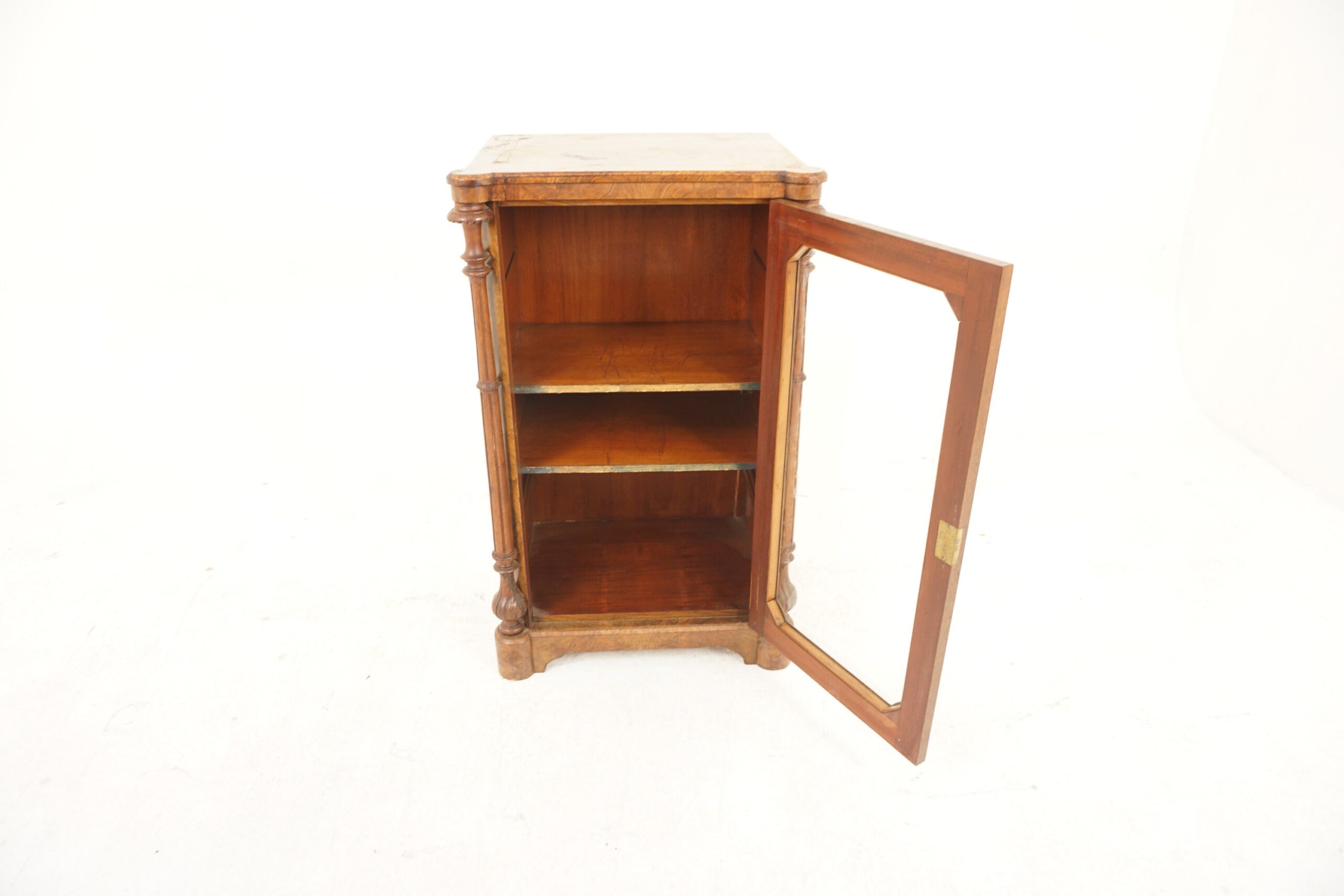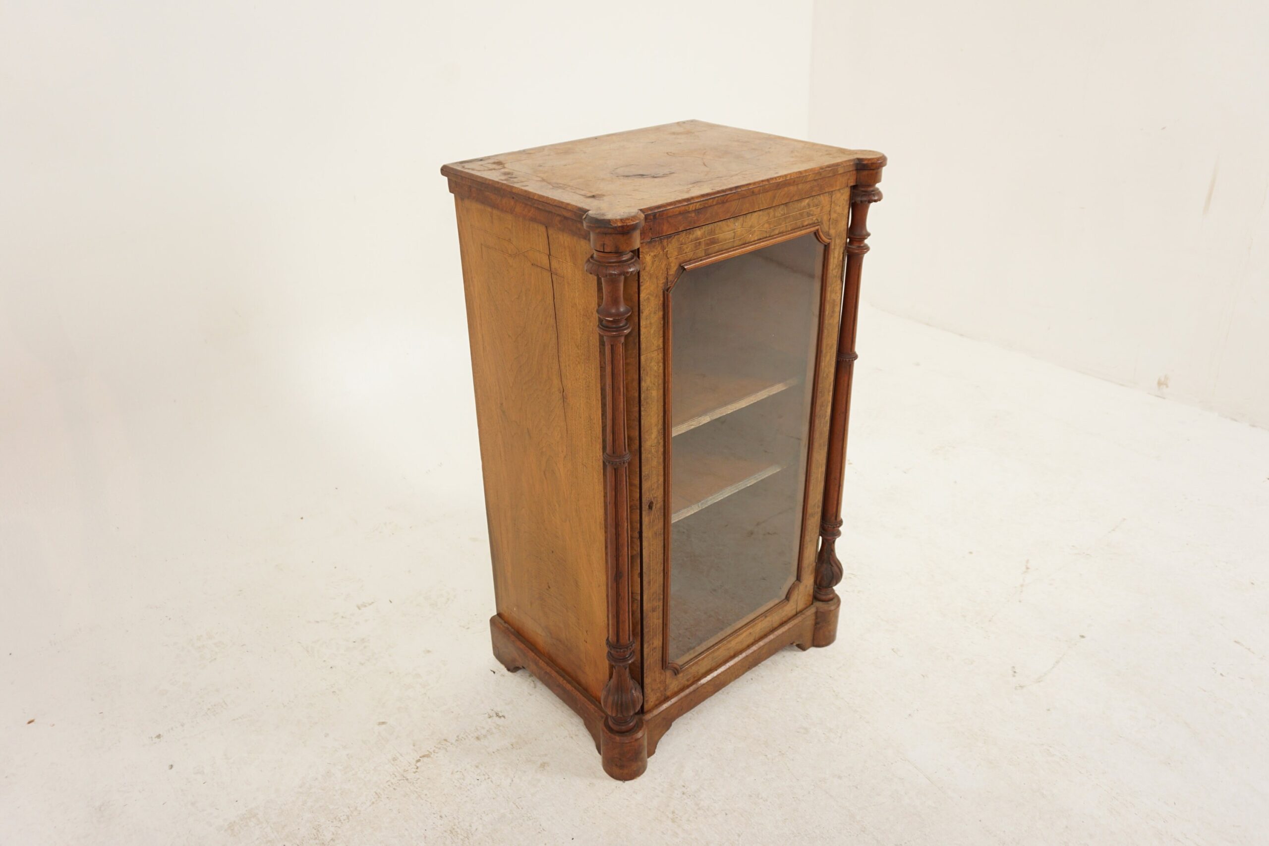 Quality inlaid burr walnut top with a molded edge above a single glass door