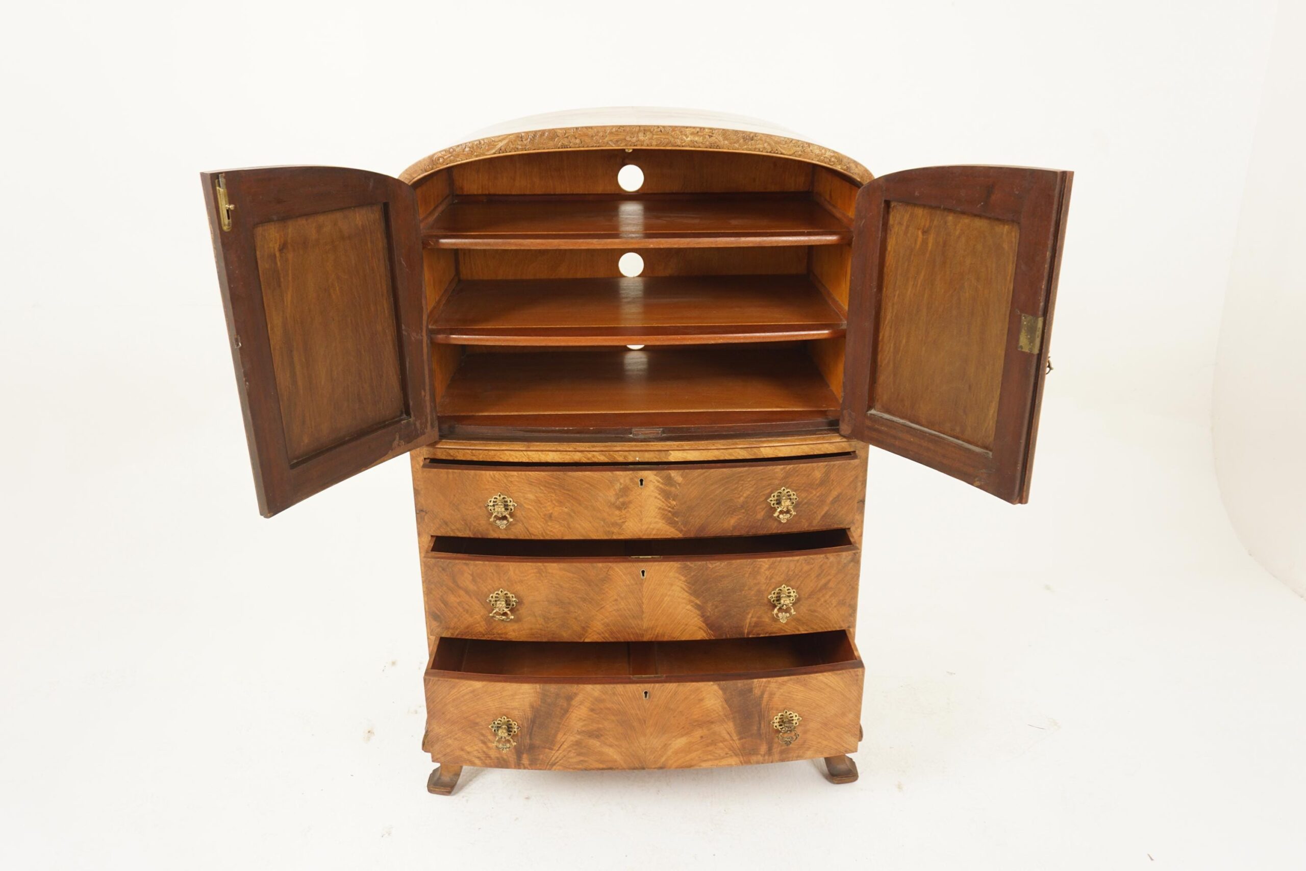 Art Deco Burr Walnut Two Door Tall Boy, Chest of Drawers Dome Top H1216