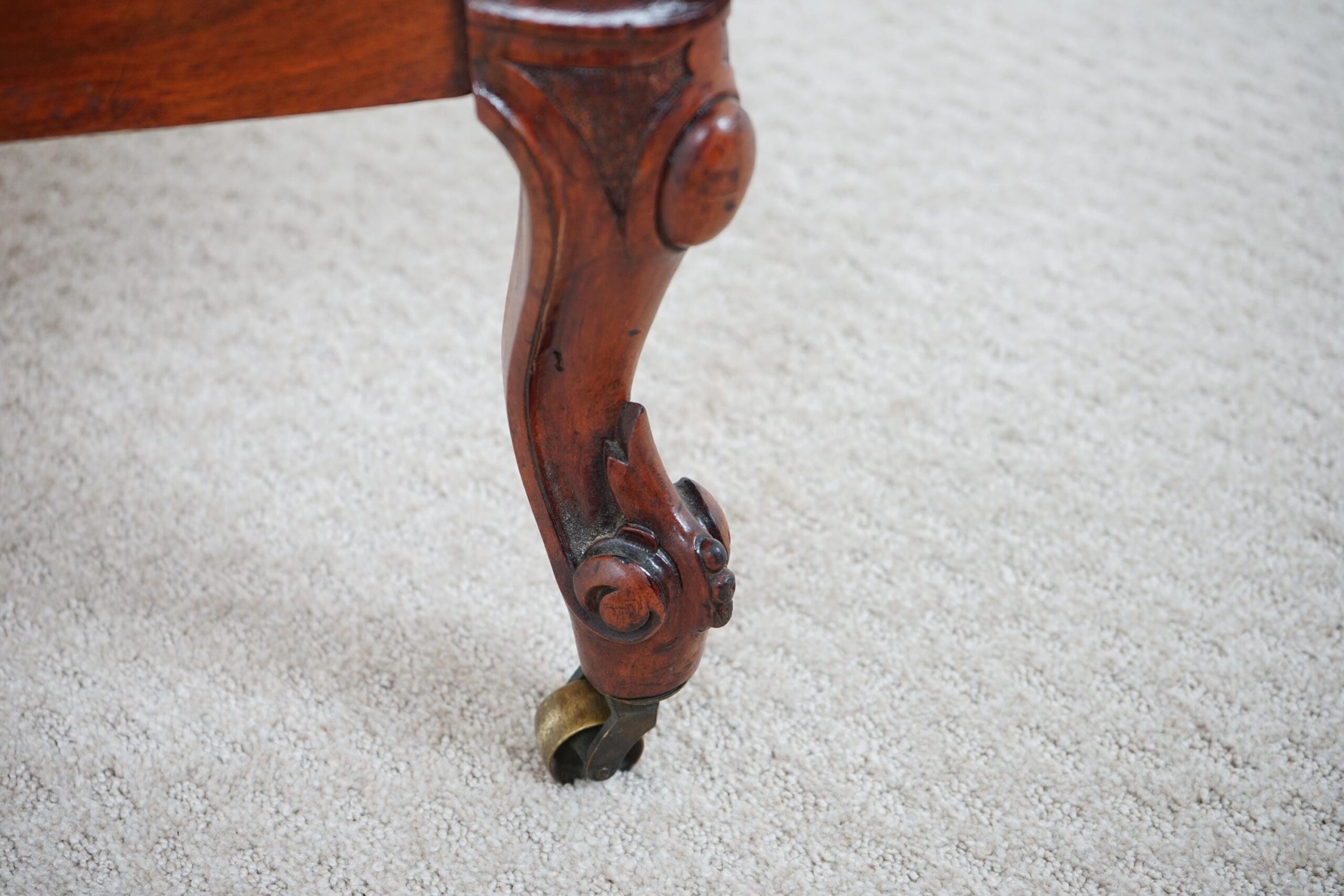 Crisp floral carving to the top is flanked by scrolling carved panel.