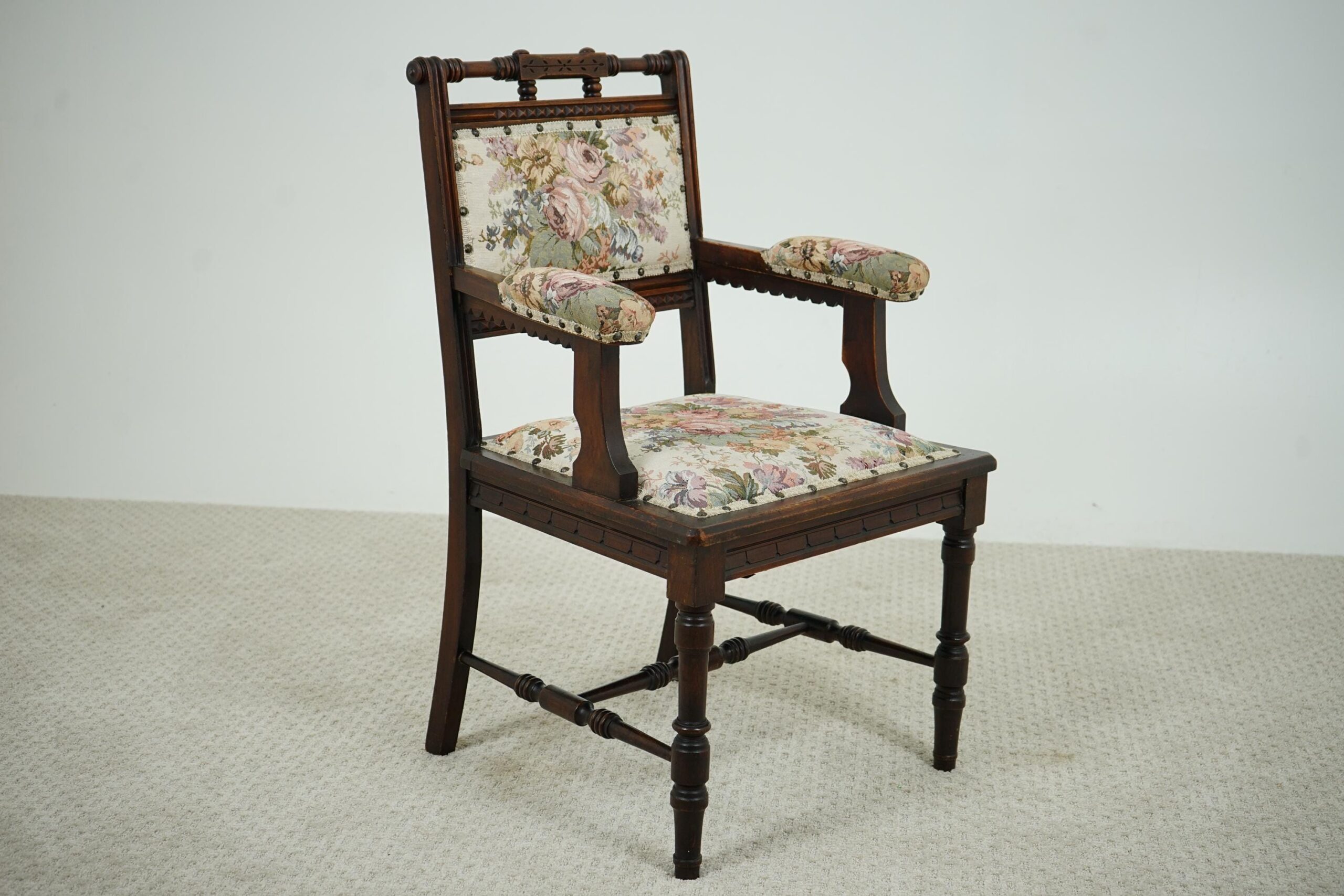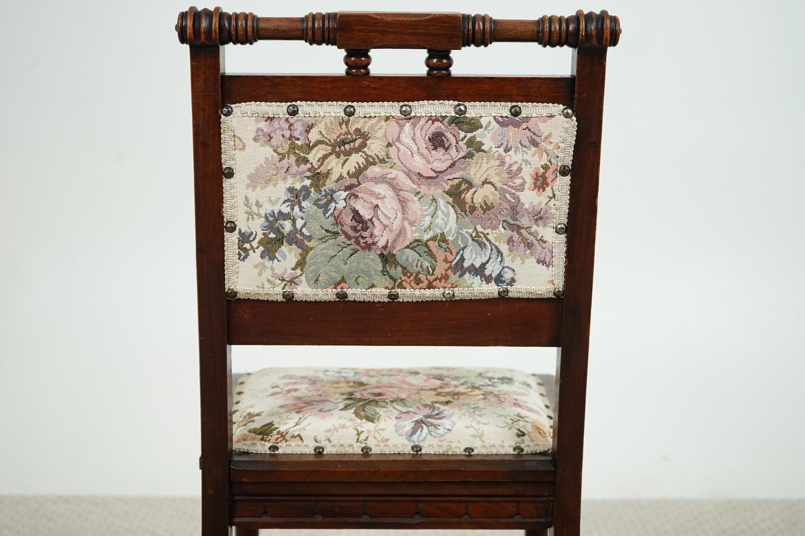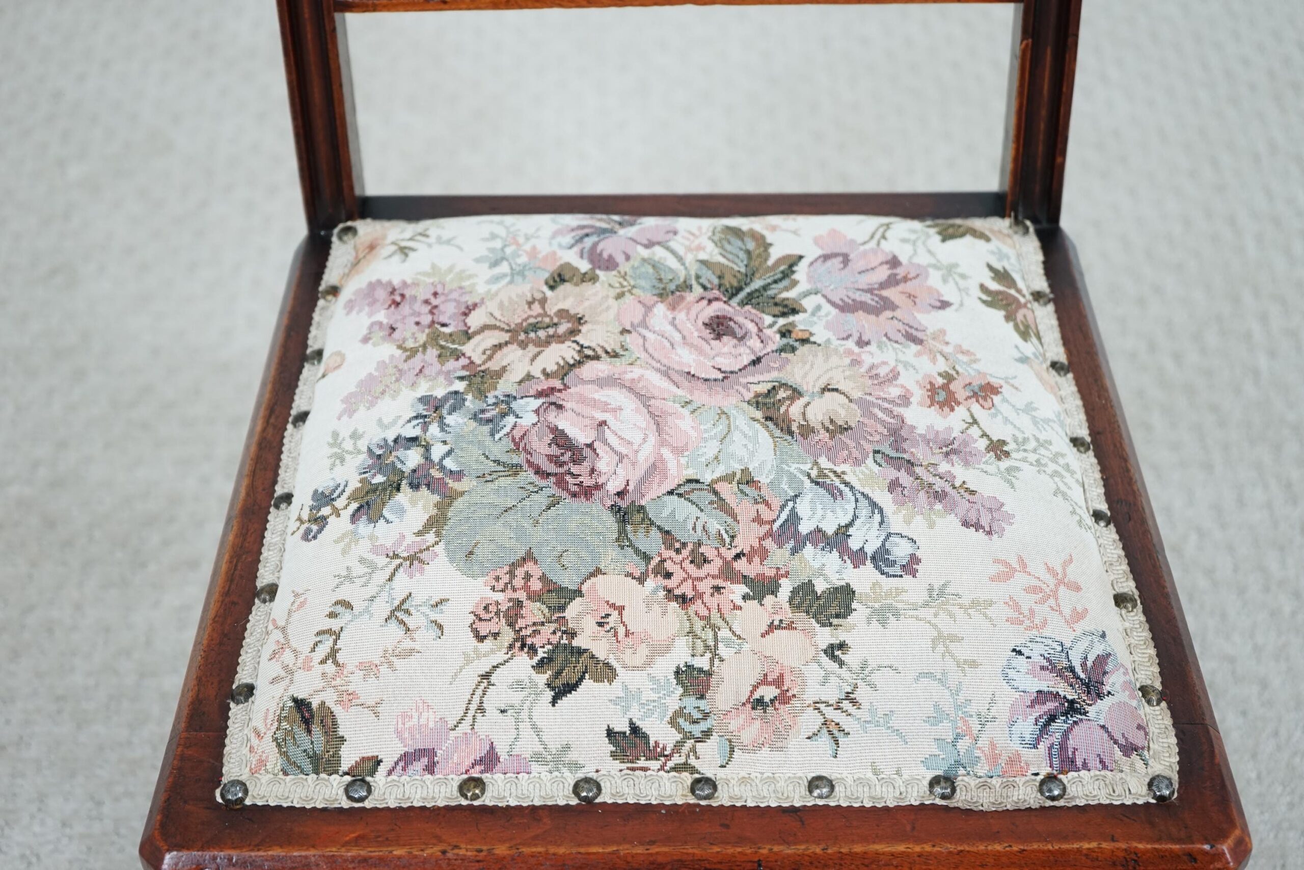 Fully upholstered seat with carved rail around the perimeter of the chair