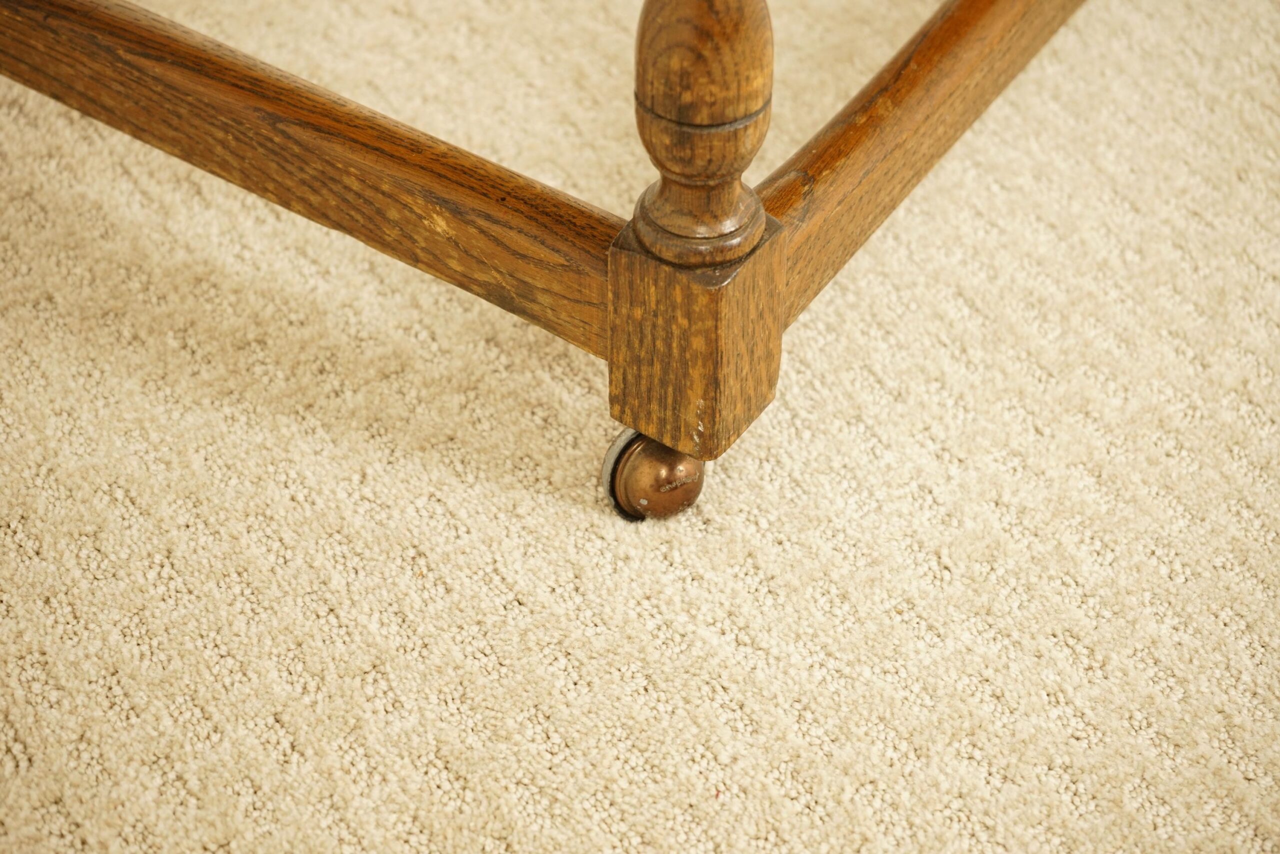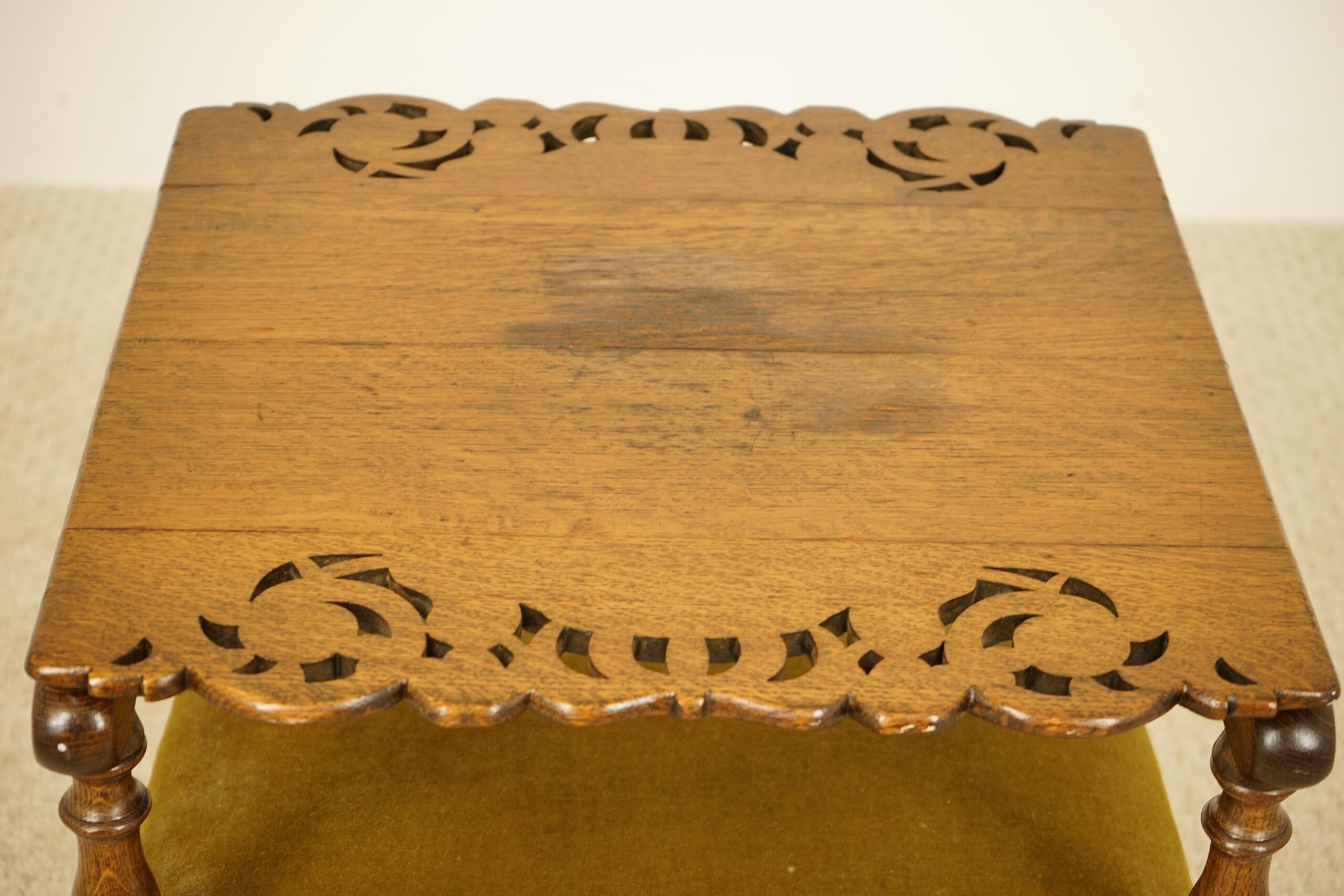 All standing on turned legs to the back with an H stretcher underneath. All solid but please note dark mark on top and two splits.