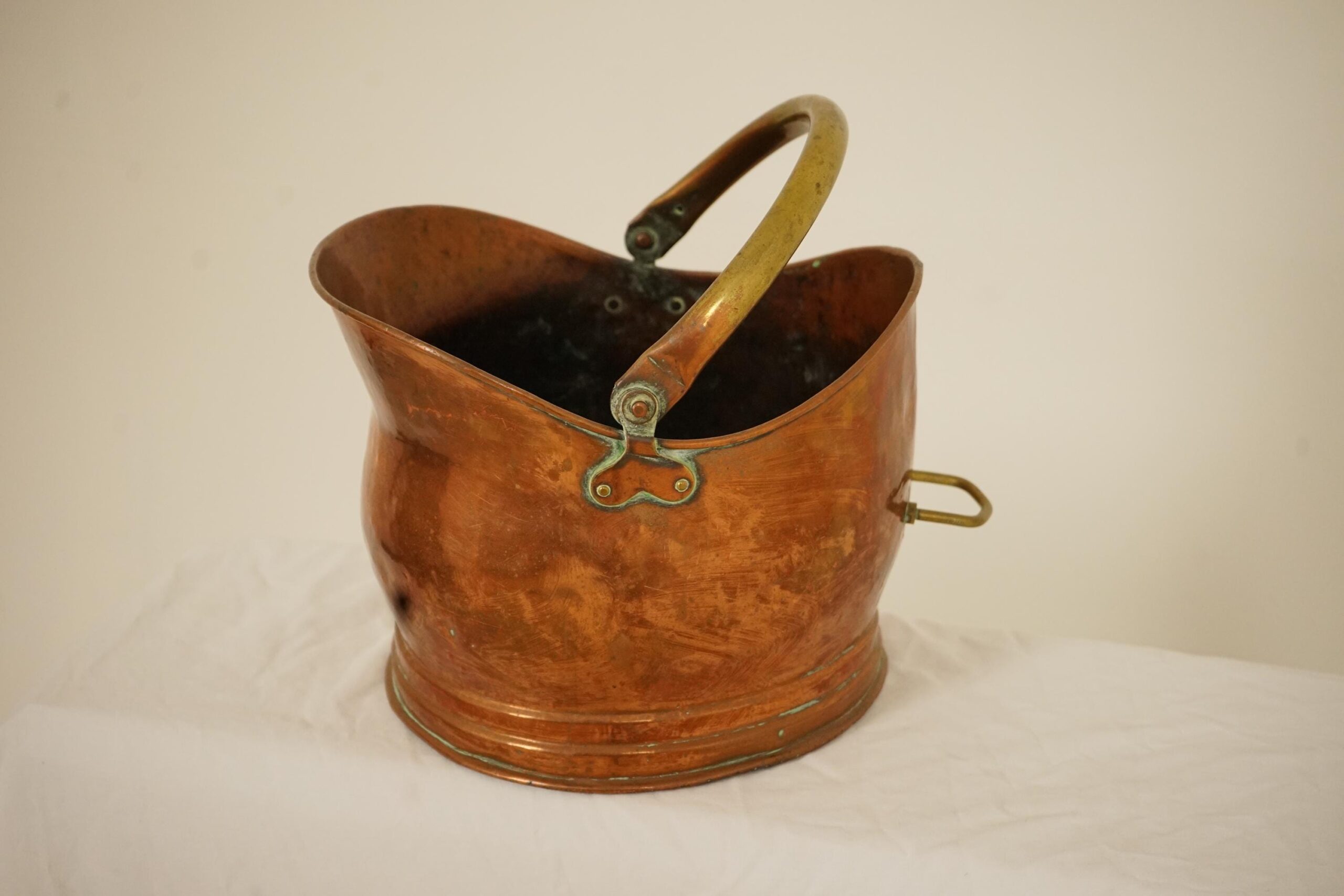 Copper coal hod in the form of a helmet